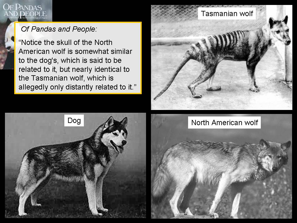 A. It's really weird. If I can give you an example, this one here comes from their figure 5-2. This is their drawing of a dog, a wolf, and an animal called the Tasmanian wolf, which is considered by all scientists to be a marsupial and not a placental mammal. Marsupial are animals like possums and kangaroos and phalangers and koalas and wombats that are a quite a different branch from the placental mammals, humans, primates, bats, wolves, things like that.