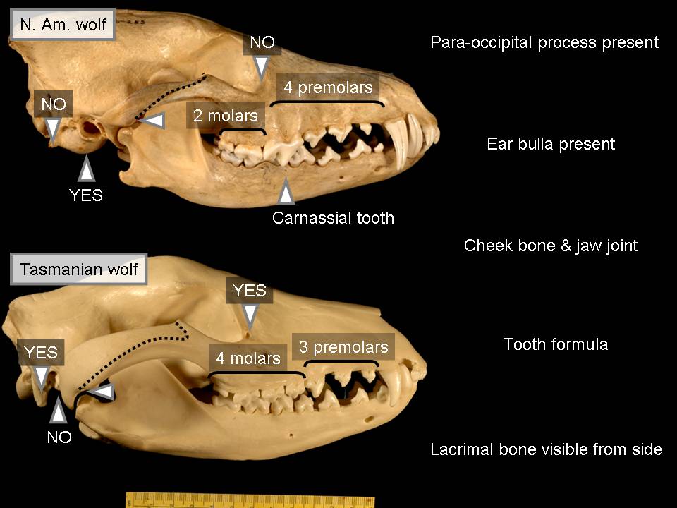 Then the next one here is the North American wolf and the so-called Tasmanian wolf, and in these features again every one of them is opposite, where you get no's, you get yes's, the numbers are wrong, and the carnassial tooth we see in the wolf above is missing in the Tasmanian wolf. So in these features they're completely different.