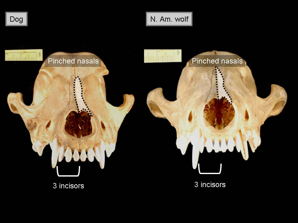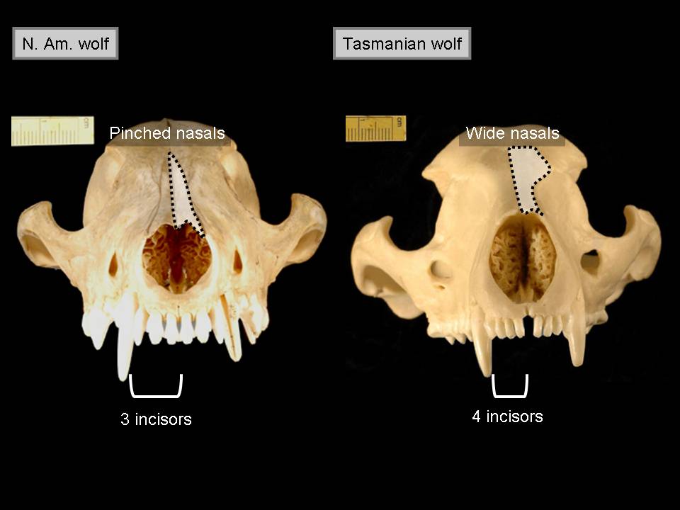 Let's go to the next slide, just looking at it the front way, which was not shown in Pandas, but the dog and the wolf, just to show that they both have nasal bones that are narrow or pinched in shape, with three incisors. The next slide contrasts the wolf with the Tasmanian wolf. The Tasmanian wolf has wide nasals and it has four incisors, which you wouldn't see from the side shot that the Pandas authors showed.