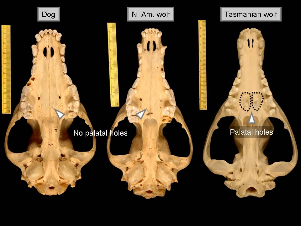 The next slide shows you a few of these skulls from underneath. The Tasmanian wolf has holes in the roof of its mouth, or palatal holes, which are lacked by the dog and the North American wolf. And the next slide shows the jawbones of these animals which have an opposite number of molars and premolar teeth between the Tasmanian wolf, and the dog and wolf.