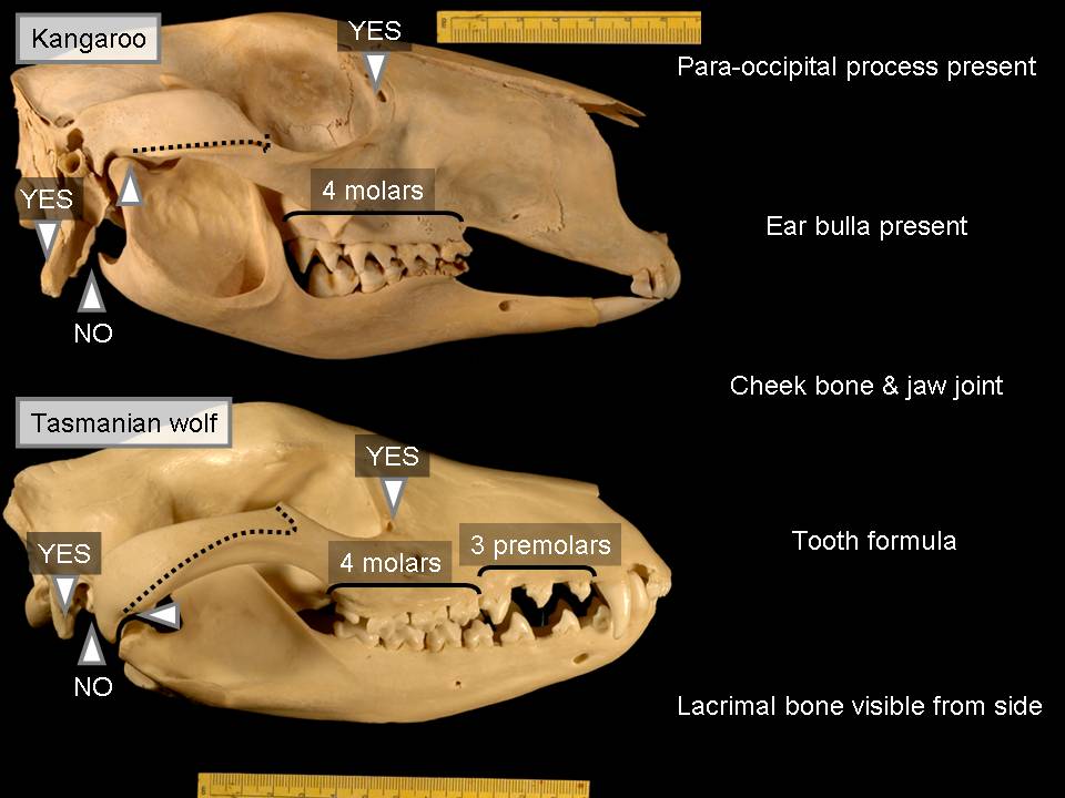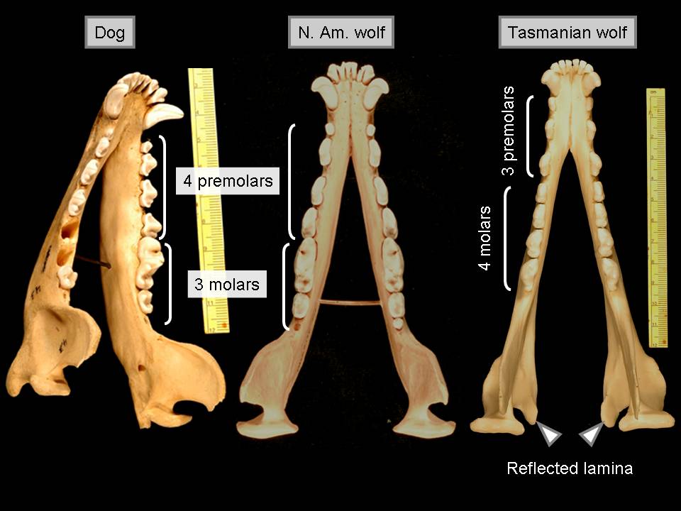 Also you'll see that Tasmanian wolf has a couple of structures at the back of the jaw which we call the reflected lamina. The term is not important, but it's just a significant feature that's not present in the dog and the wolf. Well, let's do our next comparison and look at the Tasmanian wolf as it relates to the kangaroo, which we know is a marsupial.
