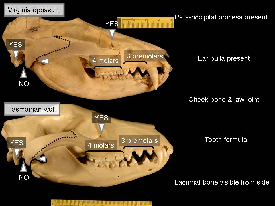In all the features that we've been looking at so far the kangaroo and the Tasmanian wolf correspond exactly with one exception, which is that the kangaroo doesn't have three premolars, and it doesn't have three premolars because the front of its face is modified in a way that many plant eating animals are modified. They lose those front cheek teeth and they developed the very most front teeth in the skull into a cropping organism that they use to, a cropping organ that they use to crop grass and other plants. Except for that, the features of the two skulls correspond. The next one, if you like that here's the Tasmanian wolf against the possum, and although --