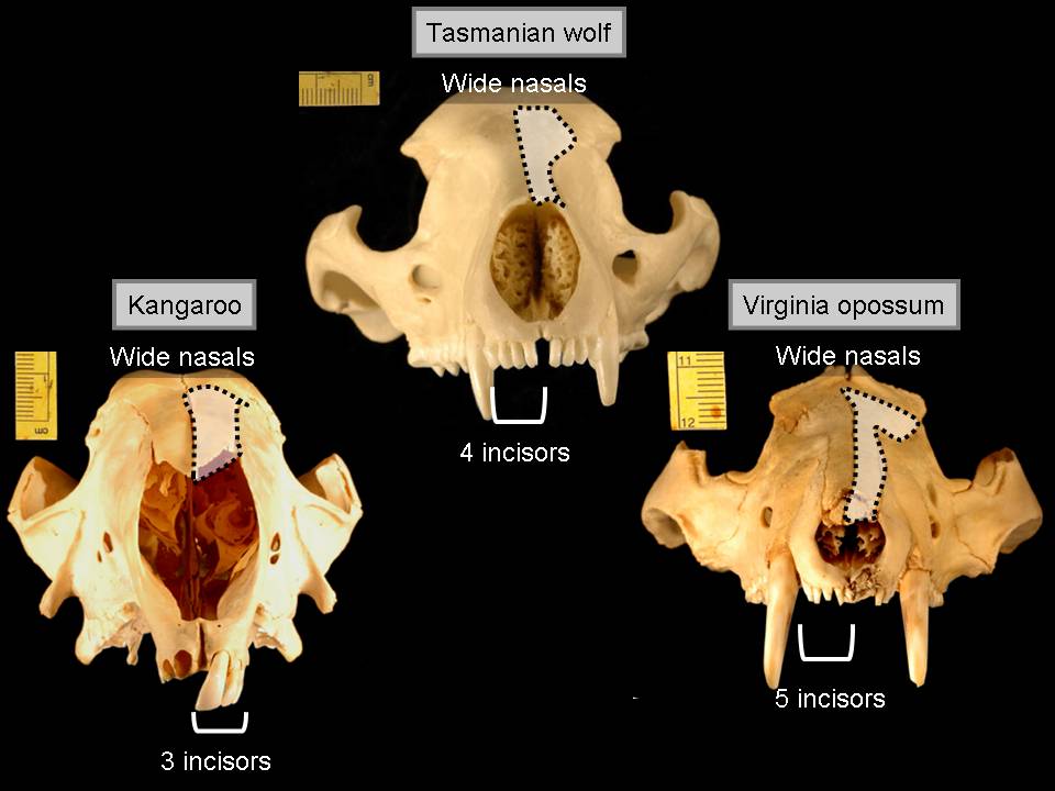 A. Another marsupial, yeah, our garden variety possum here, and although we saw that the kangaroo didn't have those first three premolars in front, the possum does. And the possum corresponds in all respects to those features in the Tasmanian wolf. Let's go a little bit further and look at then from the front. In each case all three, the kangaroo, the possum, and the Tasmanian wolf, have wide nasals. They have a different number of incisors, but they don't have three, except the kangaroo, which has very strange front incisors.