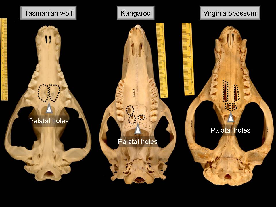 The next slide shows these three marsupials from the bottom. So I can just go back one, thank you. Shows these three skulls from the bottom. You can see that they all have palatal holes, holes in the roof of the mouth, which the dog and the wolf don't have. And the next slide I believe shows the jaws of these three animals, which everyone classifies as marsupials, which all have four molars, three premolars, except the kangaroo for reasons explained before, and they all have this reflected lamina in the back of the jaw.