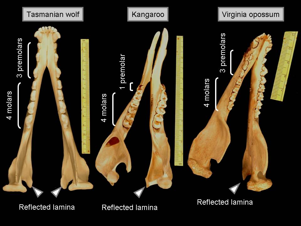 | Slide 97: All three marsupials share four molars and reflected laminae. |