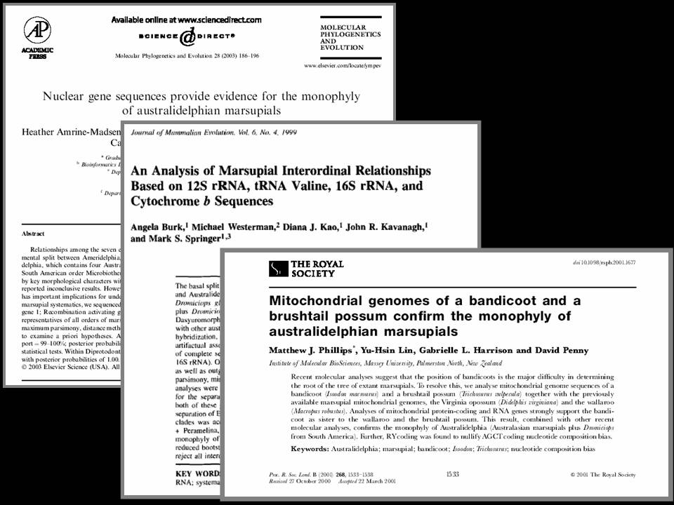 A. Sure. One is from Molecular Phylogenetics and Evolution. Its title is, "Nuclear Gene Sequences Provide Evidence that a Monophyly of Australodelphian Marsupials" by which monophyly means that they all come from the same ancestors, the australodelphian marsupials means the guys that we know that are down there in Australia and some South American mammals.