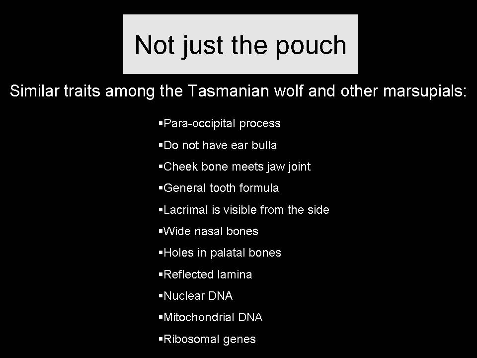 A. I think the next slide might give us an indication that in summary it's not just the pouch. It's all these similarities here that link the Tasmanian wolf to the other marsupials and exclude them from the placentals, and that probably should be brought out to students. I believe the next slide gives us an indication of --