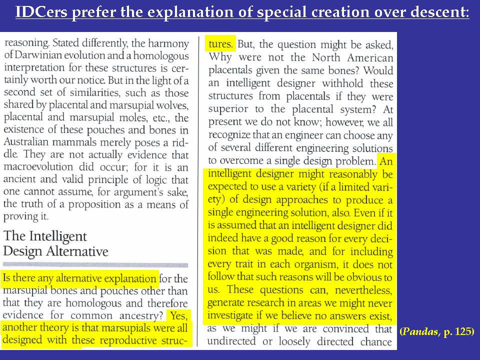A. I think the next slide might give some indication of that. It seems quite clear from their text that they prefer the explanation of special creation over descent. The highlighted passages here from page 125 of Pandas ask if there is any alternative explanation. They say yes, another theory is that marsupials were all designed with these reproductive structures.