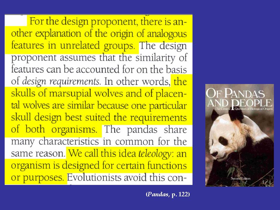 A. Well, this concerns me. They say, "For the design proponent, there is another explanation of the origin of analogous features and unrelated groups." They say, "For example, the skulls of marsupial wolves and of placental wolves are similar because one particular skull best suited the requirements of both organisms." We call this idea teleology. That is, they define this as organism that's designed for certain functions or purposes.