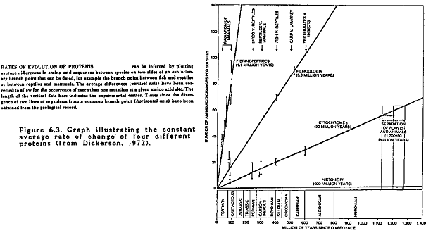 The above considerations are the basis for the idea of a molecular clock. The distance similarities shown in Pandas' Figures 6-9 to 6-13 support the idea that differences in the cytochrome c chain have accumulated at a steady rate (as Pandas admits on p. 147). Figure 6.3 (from Dickerson, 1972) plots the average difference in amino acid sequence between organisms on two sides of an evolutionary branch point, say, between reptiles and mammals (vertical axis) versus the time elapsed since the divergence occurred as determined by the geological record. This is done for four difference proteins. In each case the points fall close to a straight line, indicating a constant average rate of evolutionary change. Note that we are dealing with similar average rates on different branches of an evolutionary tree, not some deterministically fixed mutation rate as Pandas implies (p. 147).