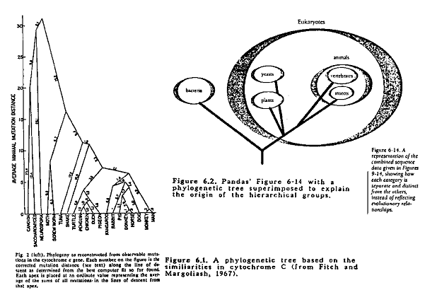 The patterns depicted in Pandas' Figures 6-9 through 6-14. correspond to the common branching points on the tree shown in Figure 6.1. This is clearly shown in Figure 6.2 where an evolutionary tree is superimposed over Pandas' Figure 6-14. This has been pointed out repeated by evolutionists as the fundamental error committed by Michael Denton in his book: Evolution: A Theory in Crisis from which Pandas' Chapter 6 has been taken (Landau, 1989; Scott, 1990; Schadewald, 1990; Sonleitner, 1990; Thwaites, 1989). Thus Pandas' biochemical argument against evolution is totally without any logical or biological foundation. One wonders how Denton and the creationists (sorry, design proponents), which include at least one with biochemistry training, could have committed such a gross error. It says little for their intelligence and/or veracity. Or their consistency on p. 142, the similarity of the cytochrome c pattern to the traditional taxonomic arrangement is said to be a striking confirmation of evolution; on p. 146-147 this same pattern is said to totally refute evolution! In spite of the total invalidity of this argument, it has been presented with glee(!) in many creationist publications (ex: Pearcey, 1989).