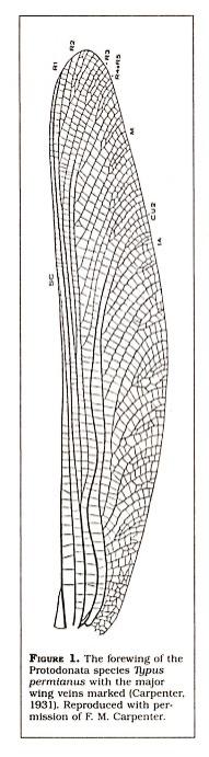 Fossil insects have received little attention in the creation-evolution controversy. Morris discusses the fossil record of insects and claims that there were "giant dragonflies, giant roaches, giant ants and so on. But their form is no different in essence from that of modern insects" (1974). But when the fossil remains of insects are examined, differences from the insects of today are apparent. The "giant dragonflies" were similar dragonflies in that they had large eyes, slender bodies, and could not fold their wings, but they still were very primitive compared to modern dragonflies. These giants belonged to the extinct order Protodonata and had wing spans of between twelve and seventy-five centimeters. Their wing venation (Figure 1) was very primitive when compared to modern dragonflies (Riek, 1970). As another example, fossil roaches included forms that possessed large ovipositors which extant roaches do not possess (Riek, 1970). Finally, there were no giant ants. The oldest fossil ant is from the Cretaceous period and had a head that was just one millimeter in length (Wilson, 1971).