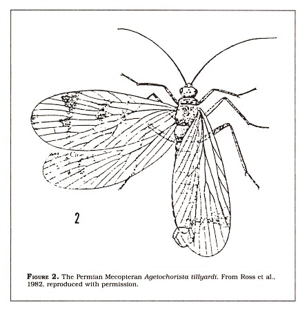 The transition between the Mecoptera (scorpionflies) and the Diptera (true flies) is one of the most impressive insect examples. The Mecoptera today is a small order of nine families with only about four hundred described species. They were, however, much more diverse in the Permian period and in the Mesozoic era with twelve now-extinct families (Ross et al., 1982). Scorpionflies (Figure 2) are small to medium-sized insects with chewing mouthparts often at the end of an elongated head. They also have a characteristic wing venation. The Diptera, on the other hand, are defined as insects possessing one pair of wings, the hind wings having been reduced to small balancing structures called halteres. The wing venation of the Diptera includes a characteristic "kink" near the base of one of the veins. This difference allows for the identification of Mecoptera and Diptera wings. Comparative studies have long suggested that the Diptera evolved from the Mecoptera. The most primitive flies, Tipulidae (crane flies), have features which are suggestive of scorpionflies (Ross et al., 1982; Riek, 1970; Gillott, 1980).