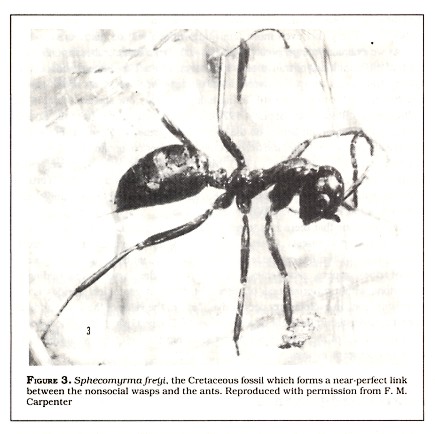 An excellent example of a family-level transition involves the origin of the family Formicidae, or the ants. The oldest "ant" (Figure 3) is from the Cretaceous amber of New Jersey. It is considered an ant because it has a modified first segment of the abdomen, called the petiole, which is characteristic of ants. E. 0. Wilson and his colleagues who described this fossil were surprised by its wasplike mandibles. In fact, this ant, as they described it in the original paper, "forms a near-perfect link between non-social tiphiid wasps and the most primitive myrmecioid ants" (Wilson et al., 1967).