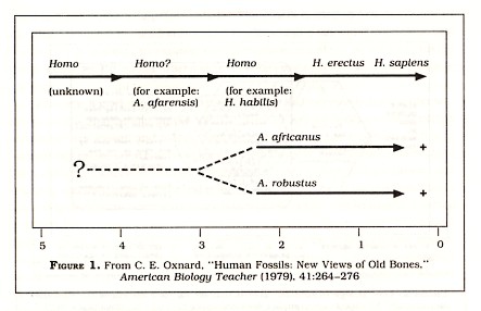 Martin Nickels' article "Creationists and the Australopithecines" (Creation/Evolution XIX) very astutely points out the dishonesty of creationists such as Gish, Kofahl, and Morris. Nickels did an excellent job showing how these individuals distorted Oxnard's work on the locomotor functions and evolution of the australopithecines. It should be reiterated that, in Nickels' article, Oxnard's position on the evolutionary lineage of the australopithecines applied only to the forms Australopithecus africanus and Australopithecus robustus and not to Australopithecus afarensis. In his 1979 paper, however, Oxnard explicitly refers to the "new fossil finds" (A. afarensis) of Johanson and others. He identified this material as humanlike and placed it on the ancestral line of humans, assuming an intermediate status. While he classified afarensis as Homo, he stated that it will probably remain classified among the australopithecines (see Figure 1). So, while Oxnard still maintains a separate line of hominid evolution for A. africanus and A. robustus, he quite clearly places A. afarensis ancestral to Homo sapiens.