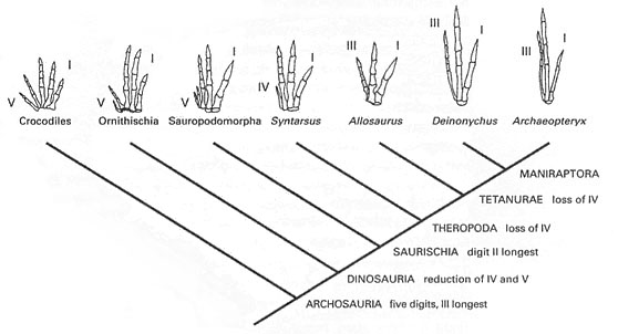 Some inferences from limb development have been used to support this conclusion (Burke and Feduccia 1997). However, no bird embryo appears with the developmental precursors of all 5 fingers (and not simply the cartilage condensations associated with the developing digits). Unfortunately the remaining 4 fingers do not come with numbers on them, so this evidence is inconclusive. Sadly, we have no prospects of developmental series from Mesozoic dinosaurs. What we do have, however, is a robust phylogeny of archosaurian reptiles (Padian and Chiappe 1997, 1998; see accompanying figure) that shows (on the basis of trees constructed from many other characters) how the hand was reduced from a 5-fingered ancestor. In all archosaurs (including crocodiles) the 4th and 5th digits are smaller than the other two. In the first dinosaurs this is still true; in theropods the 5th is at first reduced to a nubbin (Dilophosaurus) and then lost, and the 4th is only represented by the metacarpal (palm bone). This too is lost in all more derived theropods, in which only I, II, and III are preserved. III is lost in tyrannosaurs, and both III and II are lost or greatly reduced in alvarezsaurids such as Mononykus. What is interesting is that the three digits of Archaeopteryx and the other birds preserve the exact forms, proportions, numbers of phalanges, and wrist connections as those of the three-fingered theropod dinosaurs. Coincidence? Not likely.However, there may be a resolution even to the embryological problem. Wagner and Gauthier (1999) suggested that a mutation may have shifted the embryological II-III-IV series in theropods to a I-II-III position such as we see in living birds. A plausible mechanism, based on other developmental examples; it remains to be seen whether tangible evidence in this case will emerge.