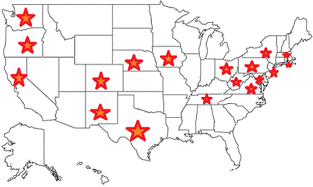 I’ve been here in Iowa all this time, and it is still surprising to see how quickly our operation has grown. (If this were a chicken franchise, I’d be rolling in cash by now!) And these maps don’t show the other states where NCSE Science Booster Clubs are burgeoning. Here’s a final map, showing you what states in the US now have some booster club presence, as volunteers work to get their communities organized. It’s important to note that in January 2016 we didn’t have a single operation running outside of Iowa. Also please note that the stars have nothing to do with the size of the volunteer effort—just the size of the state!