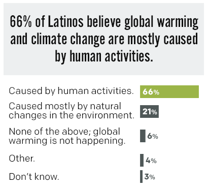 A new poll of Latinos in the United States finds that a large majority — more than four fifths — accept that climate change is real, and that a majority — almost two thirds — accept that climate change is mostly due to human activity.