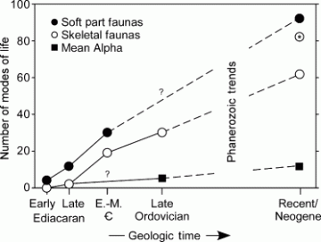 Palaeontology 50(1):1 22. "Change through time in realized ecospace. Top line represents all recorded modes of life, middle line represents modes of life of skeletal fauna only; bottom line records mean number of modes of life for single assemblages. For the Recent, the open circle represents those recent taxa with readily preserved hard parts, and the open circle containing an asterisk represents those taxa with a diverse fossil record."" title="Modes of Life as Function of Time: Figure 8 from Richard K. Bambach, Andrew M. Bush, Douglas H. Erwin (2007) "Autecology and The Filling of Ecospace: Key Metazoan Radiations" Palaeontology 50(1):1 22. "Change through time in realized ecospace. Top line represents all recorded modes of life, middle line represents modes of life of skeletal fauna only; bottom line records mean number of modes of life for single assemblages. For the Recent, the open circle represents those recent taxa with readily preserved hard parts, and the open circle containing an asterisk represents those taxa with a diverse fossil record."" class="image image-img_assist_custom" width="360" height="271" />Modes of Life as Function of Time: Figure 8 from Richard K. Bambach, Andrew M. Bush, Douglas H. Erwin (2007) "Autecology and The Filling of Ecospace: Key Metazoan Radiations" Palaeontology 50(1):1 22. "Change through time in realized ecospace. Top line represents all recorded modes of life, middle line represents modes of life of skeletal fauna only; bottom line records mean number of modes of life for single assemblages. For the Recent, the open circle represents those recent taxa with readily preserved hard parts, and the open circle containing an asterisk represents those taxa with a diverse fossil record."