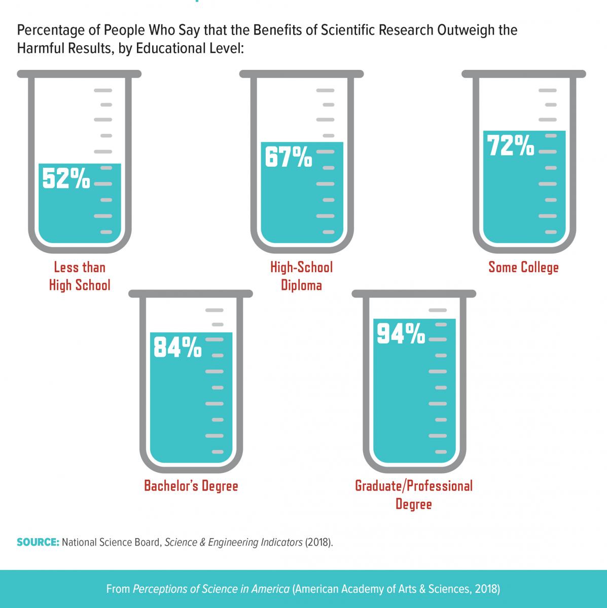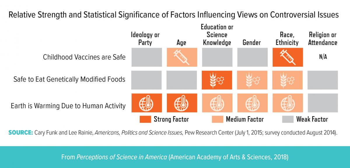 Reinforced in the report is that education matters when it comes to perceptions of science. The more education a person has, the more likely they are to express a “great deal of confidence” in scientific community leaders and to agree that when it comes to science, benefits outweigh costs. On the surface this data seems to support a deficit-model way of thinking, in which more science knowledge is correlated with more positive views of science. However, the report references other findings that suggests there is “only a small positive relationship between science knowledge and perception.” So while facts matter, the Academy’s conclusion that the facts alone aren’t enough, is reasonable.