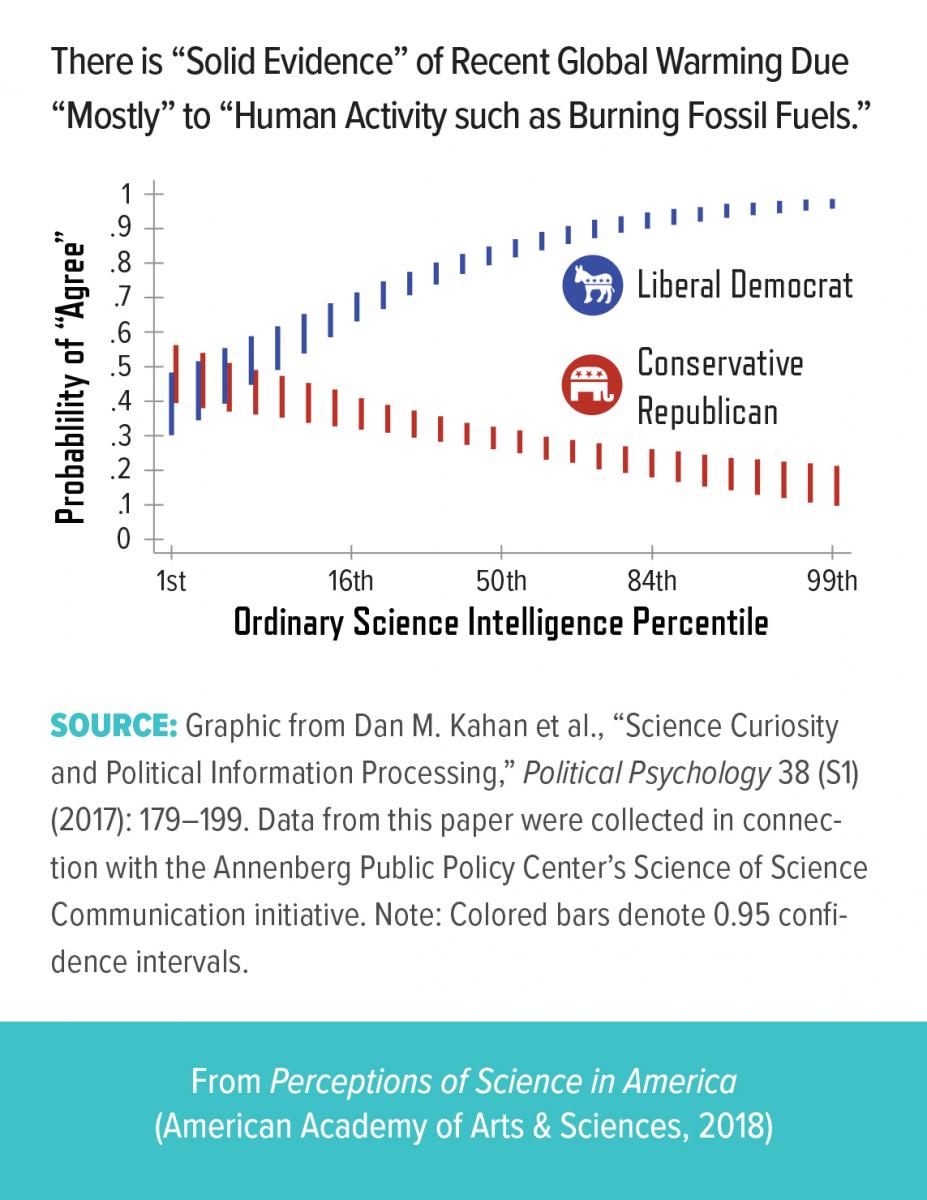 Though the data presented does suggest that one particular area will be a tougher nut to crack, even given a broader definition of science literacy. Data correlating “ordinary science intelligence” (as measured by a standard nine-question test), political ideology, and tendency to agree with the statement “there is ‘solid evidence’ of recent global warming due ‘mostly’ to ‘human activity such as burning fossil fuels’” suggests that conservative Republicans become less likely to agree with the scientific consensus on climate change the more educated they are. Though interestingly, conservatives with a higher curiosity about science “for personal pleasure” were more likely to agree.