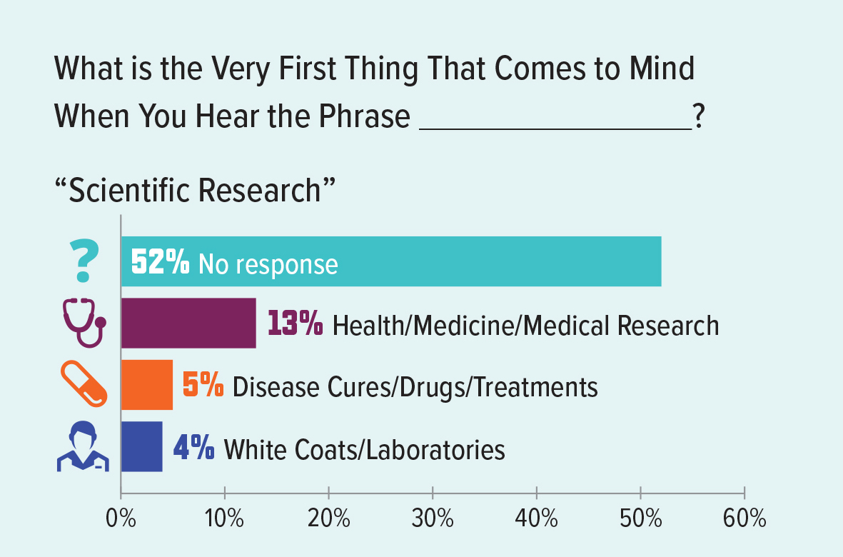 Some of the results in the report are frustrating. The fact that 52% of respondents had “no response” to the question “what is the very first thing that comes to mind” when you hear ‘scientific research’” confounds me. I know it’s been years since many of these adults were in a science classroom, but how are they unaware of the research that infuses their everyday lives, from the medicine they take, to the electricity they consume, to the well-being of the residents at their local zoos? On the bright side, it is a reminder that most people do not have pre-established perceptions of science. I wonder how students would respond to this question.