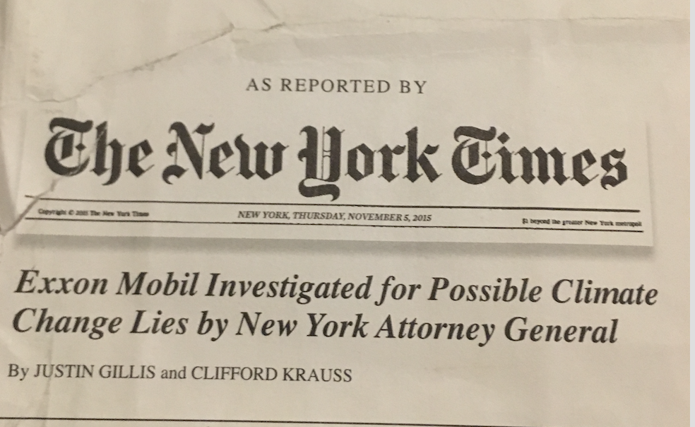 And The New York Times was unwittingly implicated. A context-free headline from a 2015 article in the newspaper was reproduced on the envelope, a deliberate attempt to create a sense of credibility before the materials were opened by the recipient. The headline alludes to “Climate Change Lies,” and was doubtless chosen in the hope that teachers will infer that the Times was exposing climate change lies peddled by the scientific establishment. In fact, the truth is about the exact opposite. The full headline was “Exxon Mobil Investigated for Possible Climate Change Lies by New York Attorney General.” The associated story discussed ongoing investigations into whether Exxon Mobil deliberately withheld the findings of its own researchers on the reality of climate change to its shareholders. But how many teachers will bother to look up the article? Heartland is hoping not many.